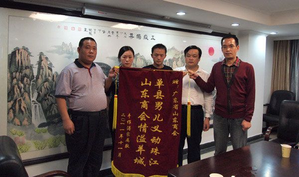 11月30日,因奋不顾身,勇救落水女子而壮烈牺牲的牛作涛烈士的弟弟牛作东等三人,专程从山东回到广州,来到广东省山东商会,代表其家属,向省商会赠送了“单县好男儿义动珠江,山东商会情溢羊城”锦旗,表达深深的谢意。