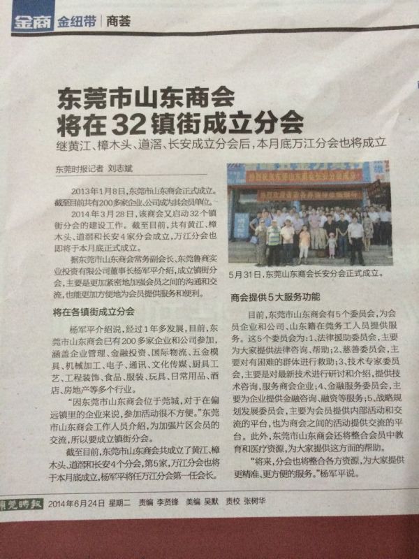东莞时报关于“东莞市山东商会将在32镇街成立分会”的报道